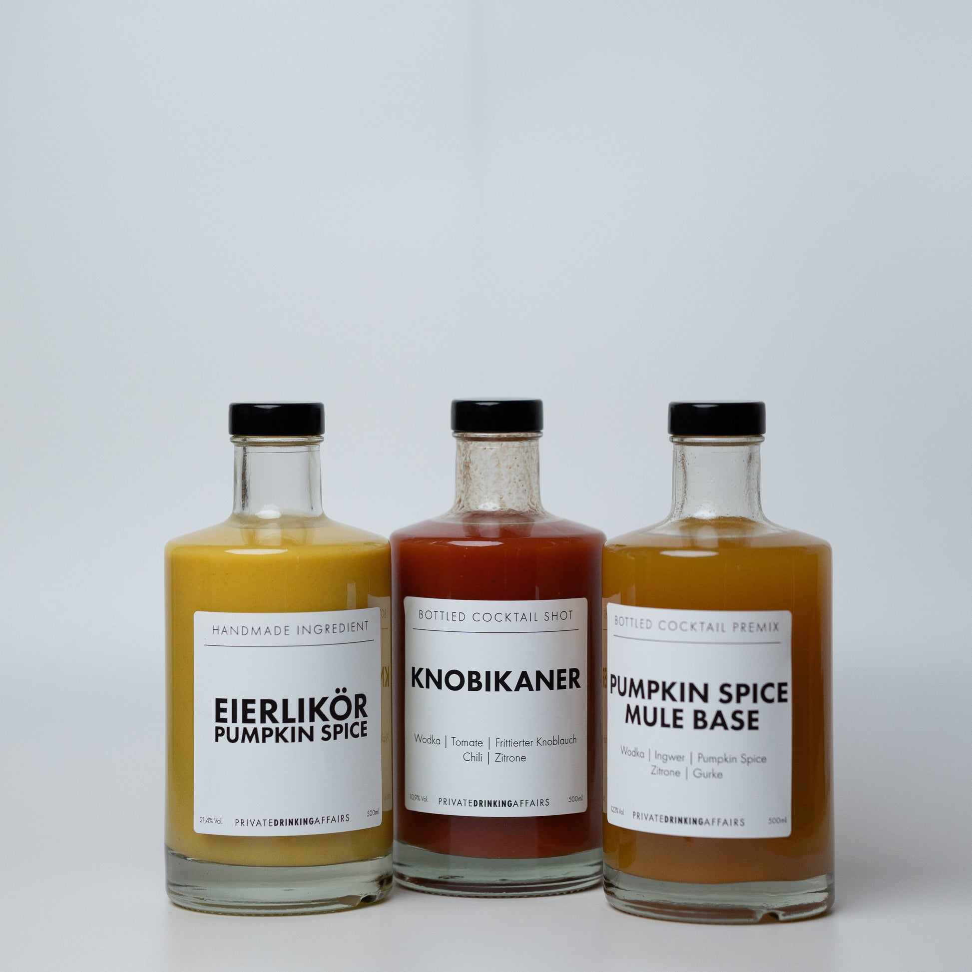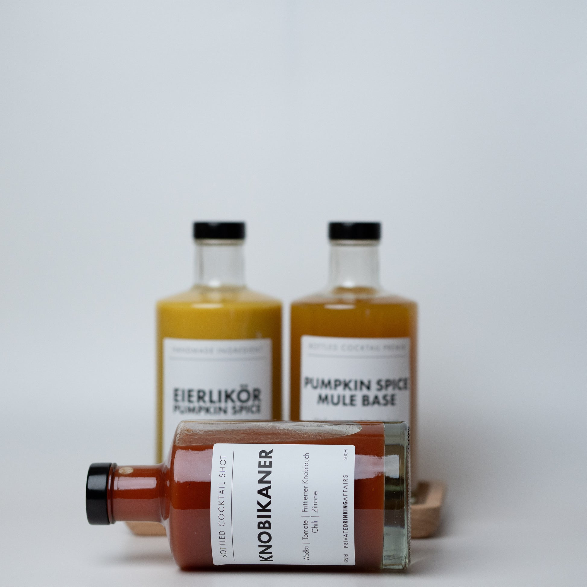 Drei Bottled Cocktails, handmade by Private Drinking Affairs – ready to serve, unwiderstehlich & garantiert nichts für Feiglinge.